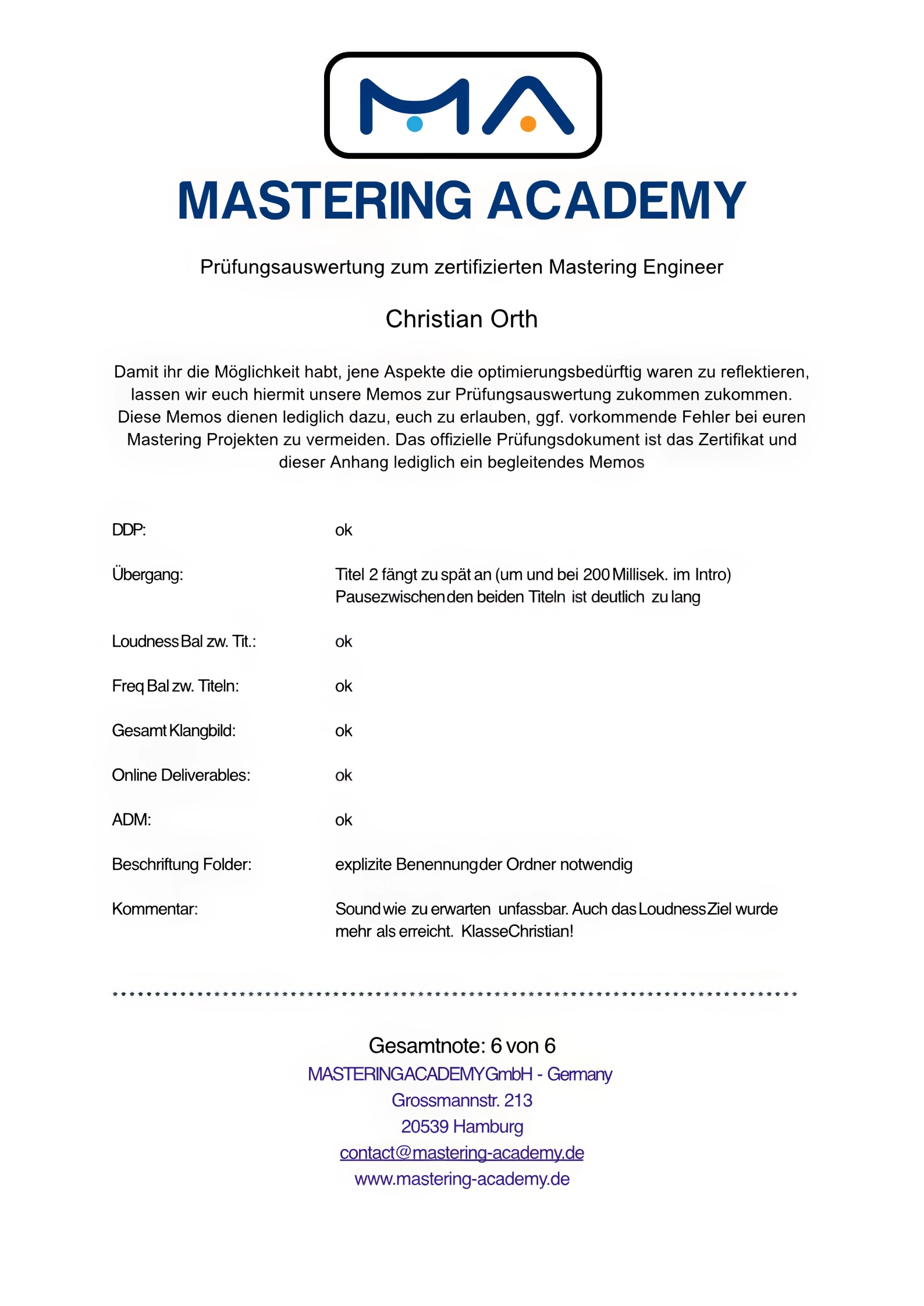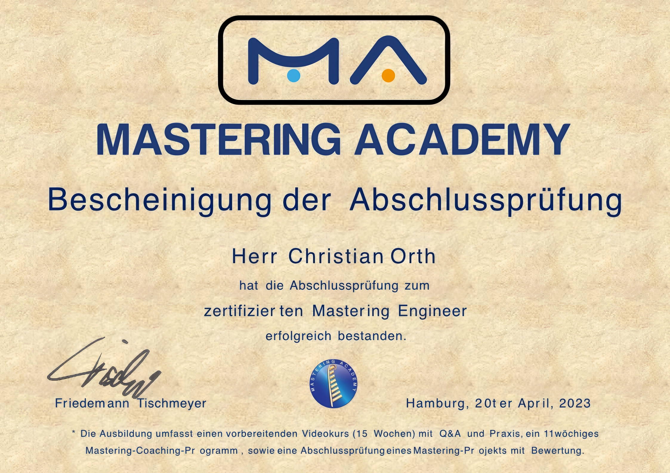 Am 31.03.2023 habe ich die Ausbildung zum Mastering Engineer an der Mastering Academy GmbH in Frankfurt abgeschlossen. Die Ausbildung war für mich der Schritt, bestehende Hör- und Arbeitsroutinen zu strukturieren und Entscheidungen im Mastering klar und reproduzierbar zu treffen.